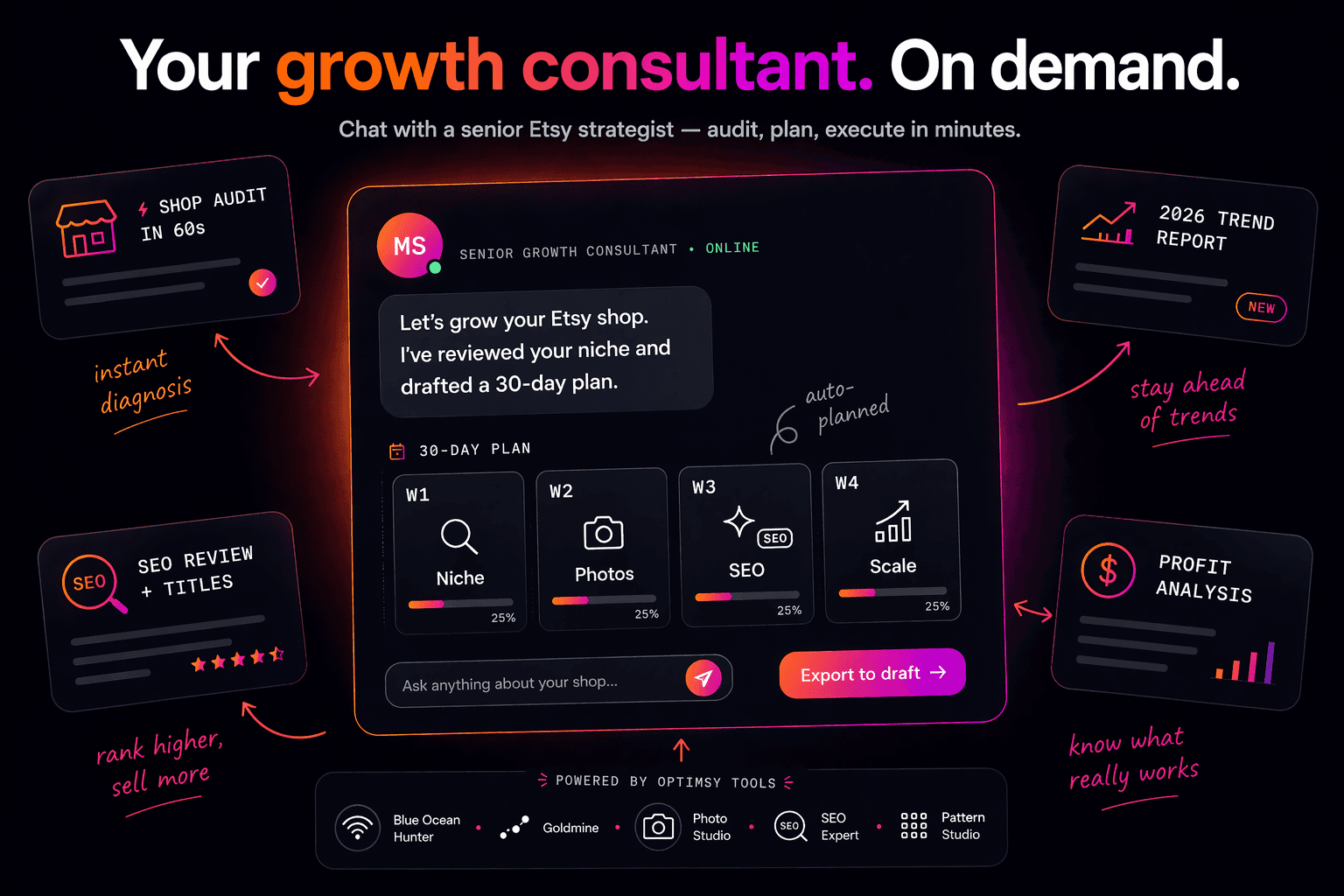 Whether you ship handmade physical products or sell automated digital downloads, Optimsy provides the exact AI-powered workflow to scale your shop to $10K/month and beyond.