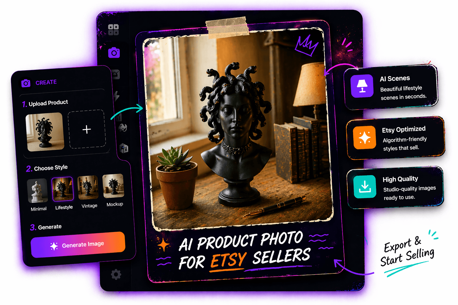 Turn amateur living-room snaps into studio-quality lifestyle images instantly.